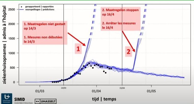 2. Er wordt op de grafiek géén rekening gehouden met de foutenmarge, die in dit geval (zie 1) zeer groot is. De lijn naar boven is telkens een worst case - dat kan niet anders, want ze is bijna loodrecht. Maar wat is de lijn in een best case scenario? Juist: de lijn die we volgen met de lockdown, maar dan zonder lockdown.